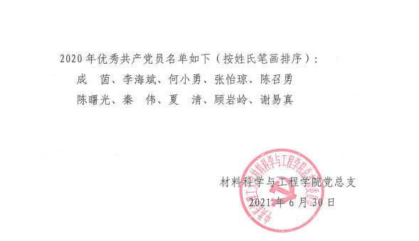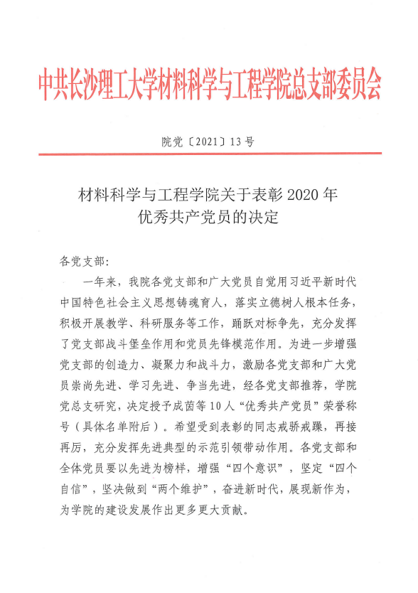 材料科学与工程学院关于表彰2020年优秀共产党员的决定(院党〔2021〕13号)