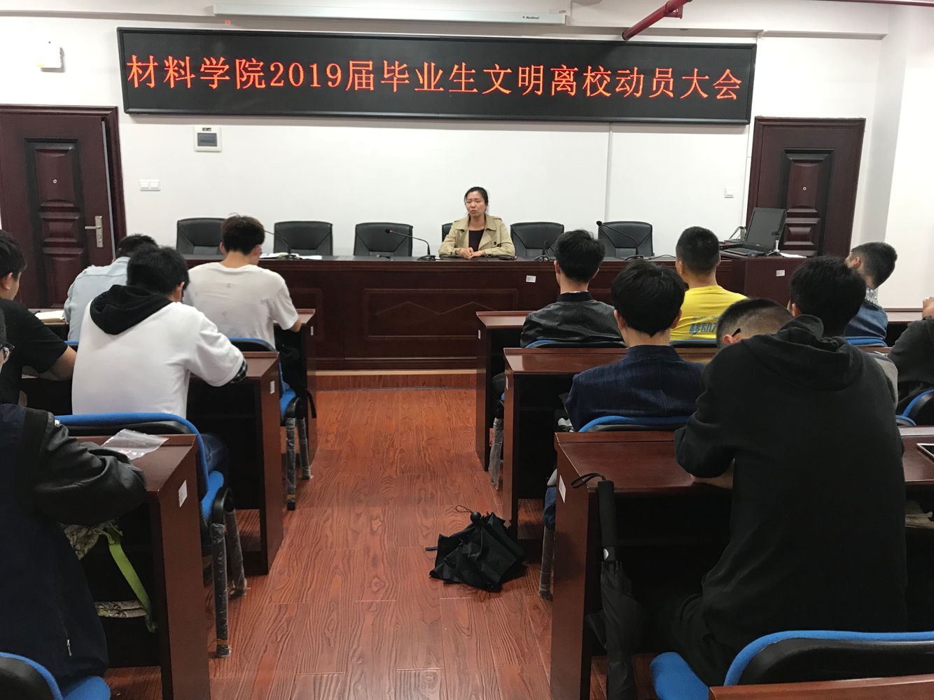 2019年4月23日上午10点半,材料学院在新能源大楼302召开19届毕业生文明离校动员大会。年级辅导员谢易真主持会议,学院党总支副书记唐青及19届全体毕业生出席会议。