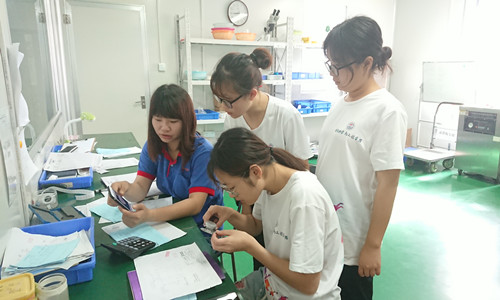 实践开始前,公司相关负责人向实践团成员介绍了产品检验的方法和注意事项,例如:如何检测产品外径、产品中出现的外观问题具体是什么样子的、用什么来检测产品外径和长度等,并向同学们展示了标准的操作方式。随后,向同学们介绍了自动扩孔机器及其工作原理,并且让同学们进行了独立实践,使同学们了解了产品检验和基础加工的基本操作,感受到了简单工作中包含的无限智慧。