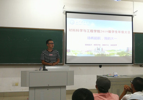 9月26日晚,材料学院在综合教学楼A206召开2019级新生第一次年级大会,学院优秀学生代表16级任新宇、17级曾佳铭、17级喻粤生出席,全体新生参加,会议由年级辅导员银波主持。