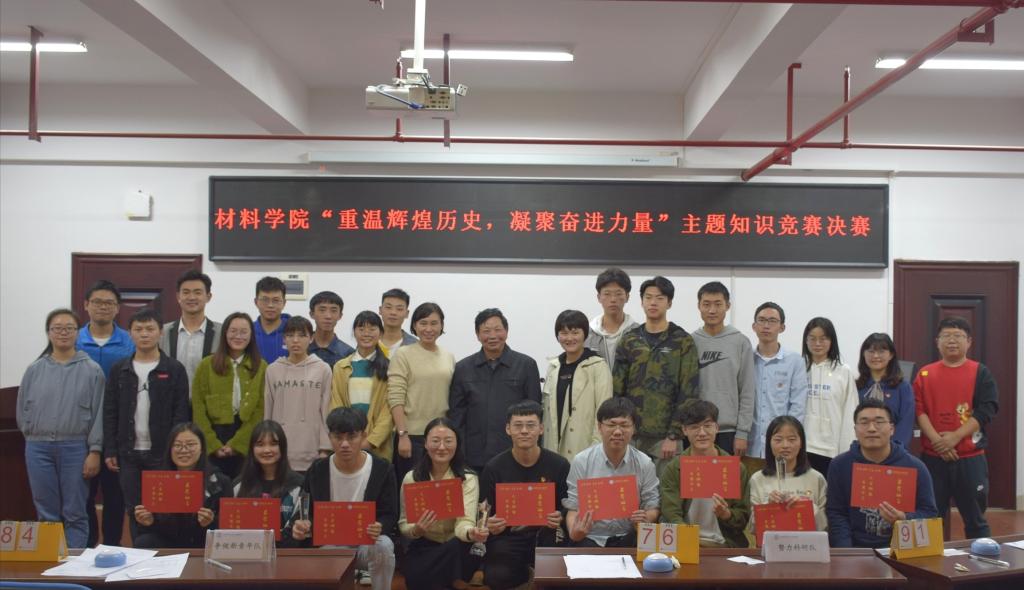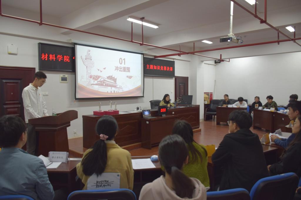 10月29日晚,材料学院“重温辉煌历史,凝聚奋进力量”知识竞赛决赛在新能源一号楼302举行,学院特邀党建组织员周再林,党总支副书记陈华,党建辅导员银波,团委书记陈鑫林出席本次活动。
