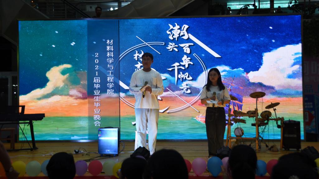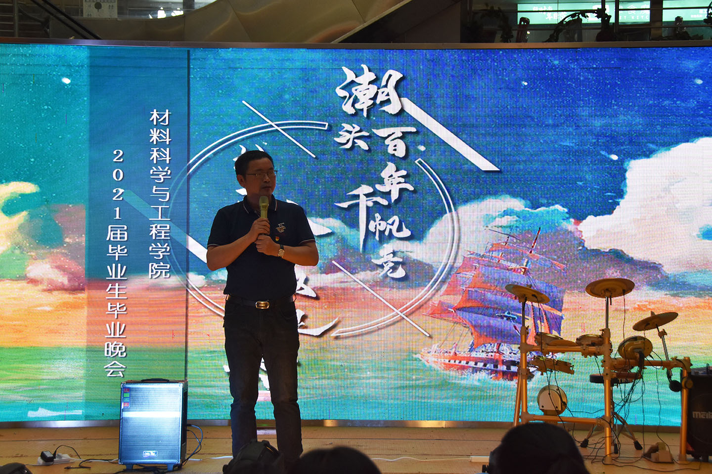 6月24日晚,材料学院于汀香园一楼举办了“潮头百年千帆竞,材志今朝驭浪舟”主题毕业晚会,校友中心主任郑延恒、院党总支书记张国强、副书记陈华、班主任杨现锋、成茵、辅导员陈鑫林、谢易真出席,材料学院2021届研、本毕业生及团学会全体成员参加。