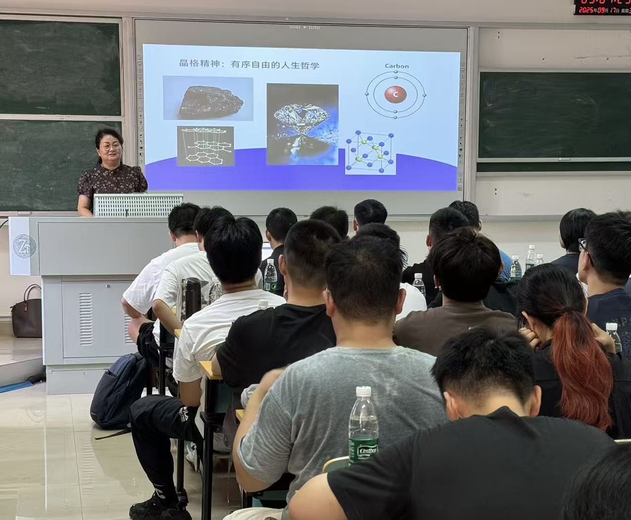 郑延恒从“晶格精神”的内涵出发,以晶体结构的“有序自由”为喻,阐释了一种兼具严谨规则与创新活力的人生哲学。他将“晶格精神”概括为四个维度:生长之向、协同之力、坚韧之核、秩序之基,分别对应方向选择、团队合作、抗压毅力与规则意识,鼓励新生在科研道路上既要有个人的坚守,也要有集体的协同。
