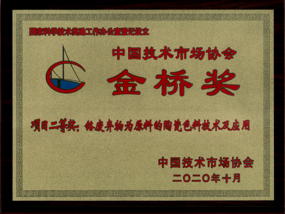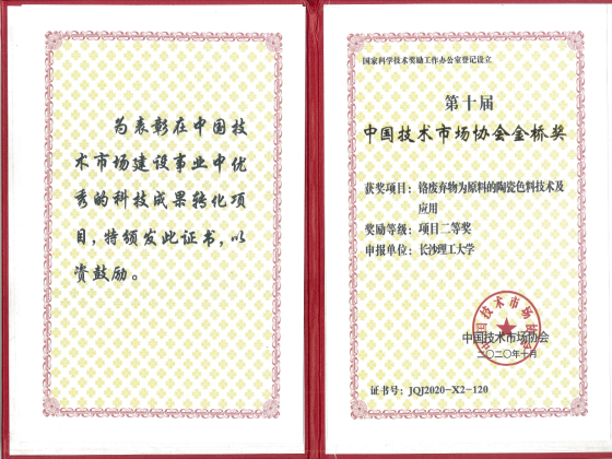 2020年10月22日,中国技术市场协会在山东淄博举办了第十届中国技术市场协会金桥奖表彰奖励大会,我院廖红卫色料团队主持完成的成果“铬废弃物为原料的陶瓷色料技术及应用”继第六届金桥奖后,再次荣获项目奖二等奖,项目第一完成人廖红卫作项目汇报,项目组成员詹文俊代表成果完成团队参加表彰奖励大会。近年来,廖红卫团队与广东佛山天宇陶瓷色料有限公司、江苏拜富科技有限公司等多家公司开展产学研合作,应用开云官网专利技术,就铬铁合铁制造陶瓷色料及高铬废弃物制造陶瓷色料核心技术产生了很好的社会、经济价值。其中近年来应用铬铁合金制造陶瓷技术生产的主打色料(黑色)占全球市场的60%以上,直接创造税利3亿元/年以上,经济效益及社会效益十分突出。