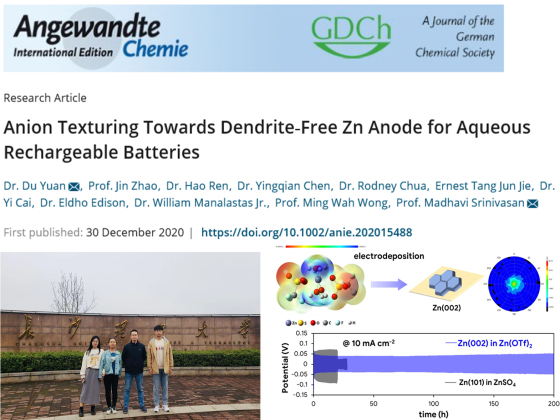 近日,开云官网湖南省团队百人计划核心成员、湖湘学者、开云kaiyun体育材料学院袁度博士与合作者们在化学领域国际权威期刊德国应用化学(Angewandte Chemie)上以开云kaiyun体育为第一单位发表研究工作“AnionTexturingTowardsDendrite-FreeZnAnodeforAqueousRechargeable