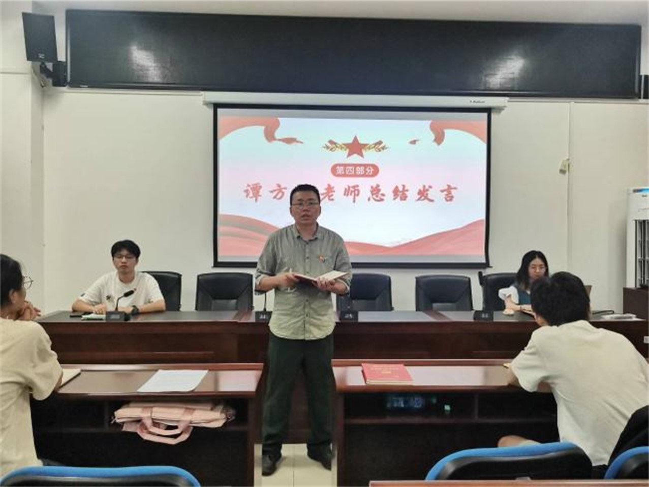 最后党建辅导员谭方林最后进行总结发言,他首先肯定了党支部成员的实践成果,同志们参加社会实践,既能锻炼实操能力,又能得到深入的精神洗礼,从而巩固信念、明确理想追求。他希望大家能够将继续保持与发扬支部的优良作风与传统,将实践经验转化为学习动力,不断自我提升,深化内在素质与能力的锻造,发挥党员的先锋模范作用。