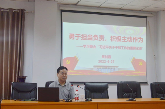 宣讲会上,黄创霞以《勇于担当负责,积极主动作为》为题,首先解读了习近平总书记在2021年秋季学期中央党校(国家行政学院)中青年干部培训班开班式上的讲话,然后从担当作为的内涵和意义、准确理解担当作为、在推动学校发展中展现担当等三个方面介绍了自己学习“习近平关于干部工作的重要论述”的体会。他强调:担当作为是新时代对共产党人的要求,新时代的党员干部要有勇于担当的责任意识,要有乐于担当的思想情怀,要有善于担当的能力素质。