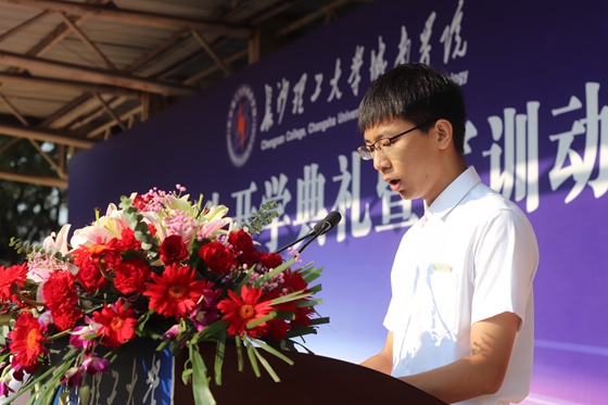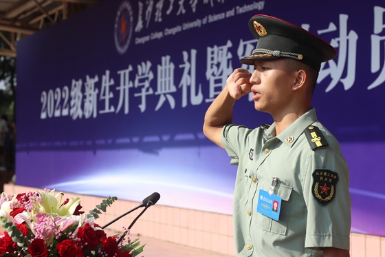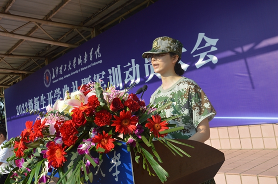 新生代表、交通土建系尹姿君同学代表全体新生感谢了为他们成长付出辛勤劳动的父母和老师,表达了自己对进入城南学习的美好憧憬。他代表全体新生表示,一定珍惜时光,努力学习专业知识,不断开阔视野,为今后的理想与人生目标打下坚实的基础,将灿烂的青春谱写成一幅色彩丰富的恢弘画卷。最后全场新生连呼三遍“请党放心,强国有我!”八字誓言铿锵有力,这响亮的青春誓言在田径场上空久久回荡。