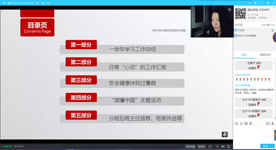 会上,武建伟对本学年的工作和学习情况进行总结。她为大家讲述了在疫情期间辅导员、班导班干、班委以及年级办繁重的工作情况,同时也希望同学们在疫情期间不要放松学习,要不断奔跑才能胜利;接着她从易班打卡、暑假安全两个方面强调同学们一定要注意自己的心理问题和人身安全,切莫让悲剧降临到一个家庭上。年纪助理黄瑶同学也督促同学们暑假期间要好好复习,平时注意锻炼;要和班委们一起创造优秀的班集体。丰崇彪表示自己很高兴能跟大家相处这一年,希望大家不要辜负武老师的期望。
