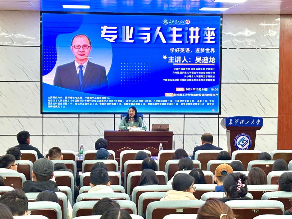 12月18日晚,城南学院文法艺术系在四教报告厅成功举办了“学好英语,逐梦世界”专业与人生讲座。此次讲座邀请了开云kaiyun体育国际工学院院长吴迪龙教授作为主讲嘉宾,由城南学院副院长贺晖主持。