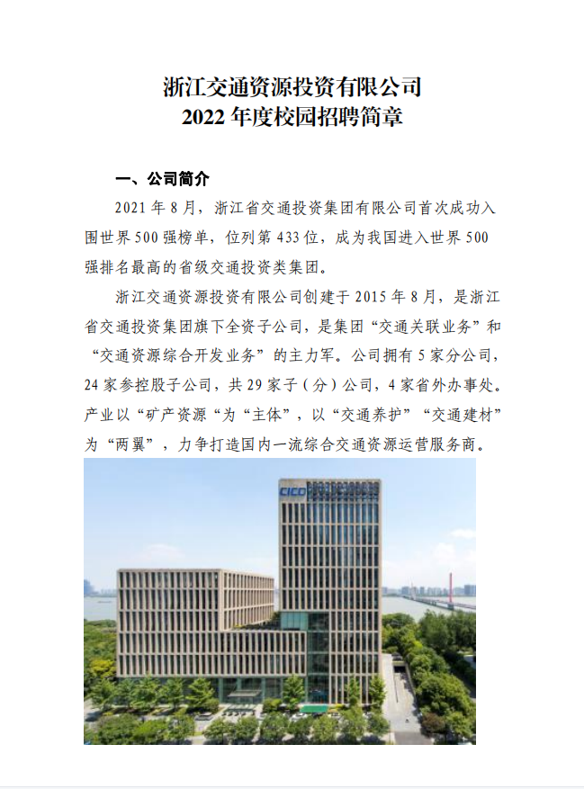 浙江交通资源投资有限公司2022年度校园招聘简章