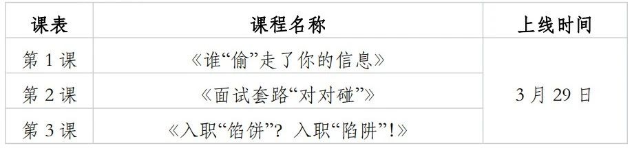 为深入学习贯彻习近平总书记关于教育和就业工作的重要指示批示精神,进一步提高大中专学校师生、家长的求职就业安全意识,教育引导毕业生防范求职就业“陷阱”,助推高校毕业生顺利就业、安全就业,省教育厅联合芒果TV精心制作了《求职避“坑”指南——学生安全就业指导课》,将于3月29日正式上线。