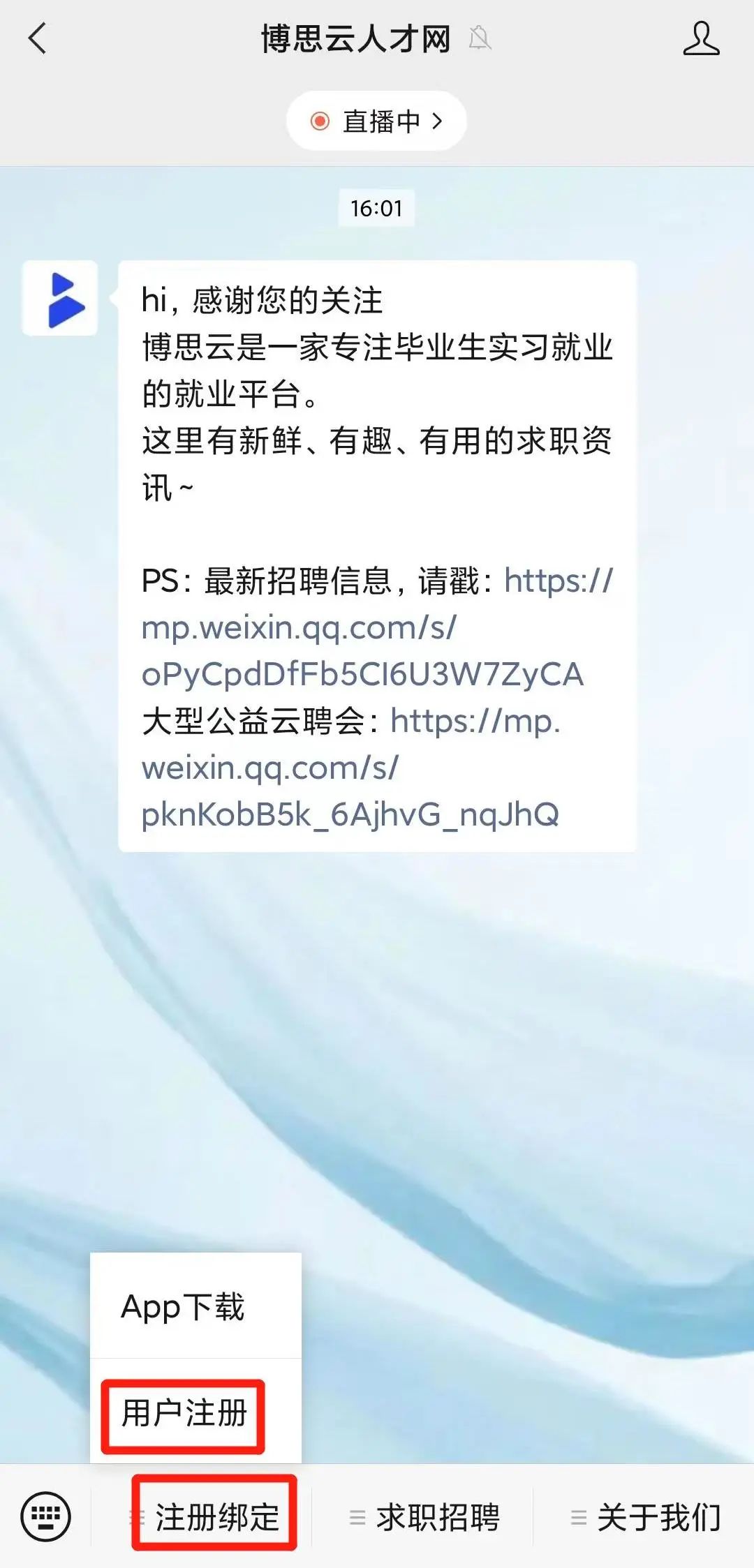 1.进入公众号,点击“注册绑定-用户注册”,跳转至注册登录页面,在“我要找工作”界面,输入手机号码,获取验证码,勾选同意协议,点击“登录/注册”。