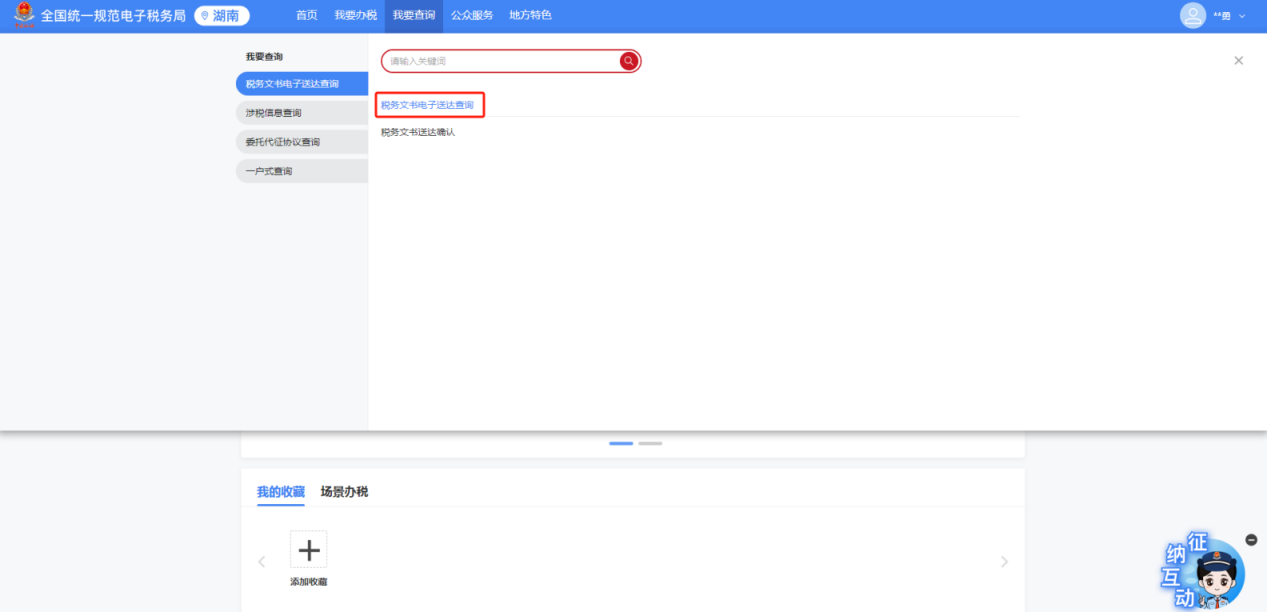 操作指引:电子税务局首页点击【我要查询】—【税务文书电子送达查询】—【税务文书送达确认】,也可在右上角搜索框直接搜索关键词进入办理页面。
