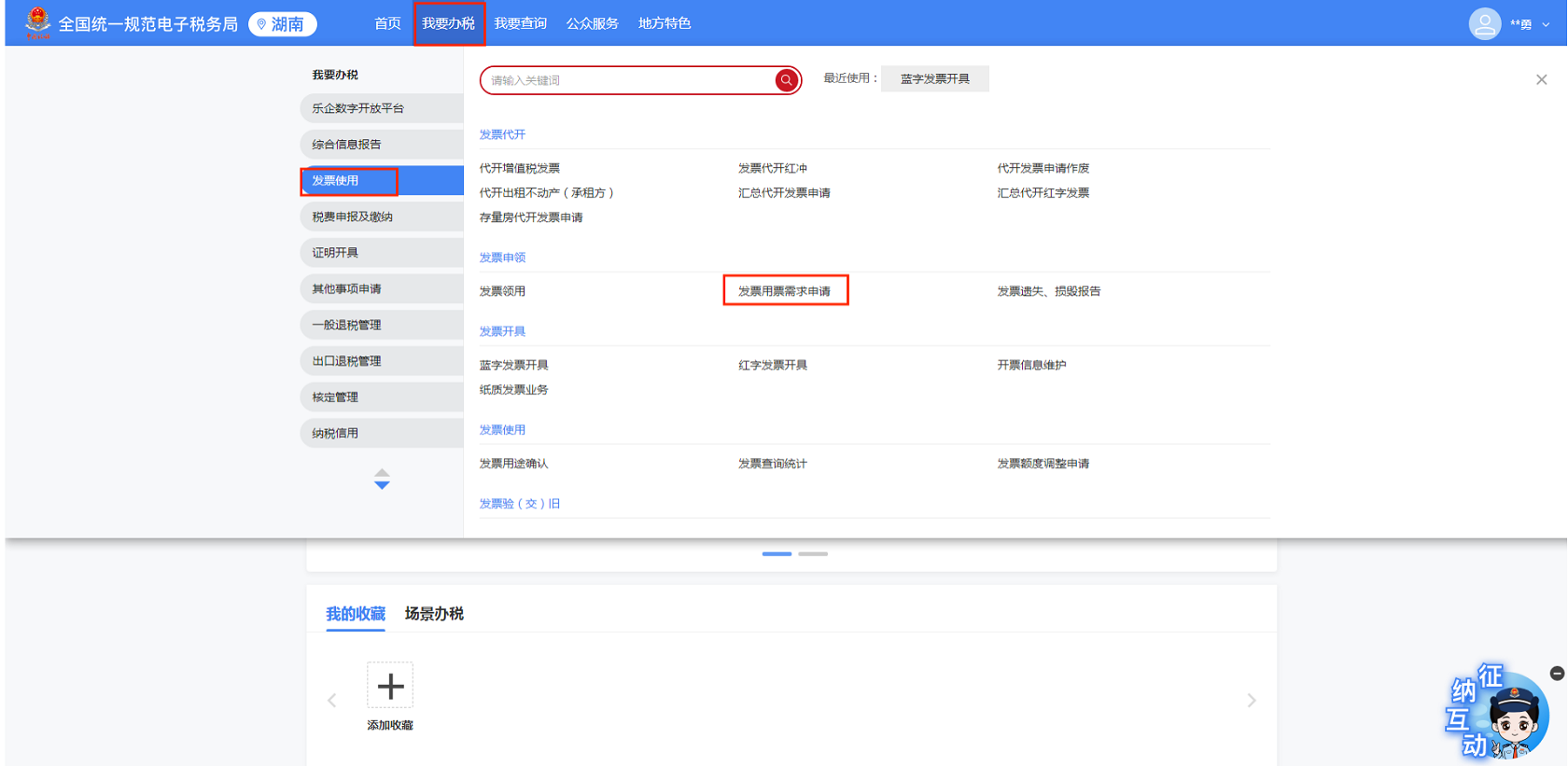 操作指引:依次点击【我要办税】—【发票使用】—【发票用票需求申请】,也可在右上角搜索框直接搜索关键词进入办理页面。
