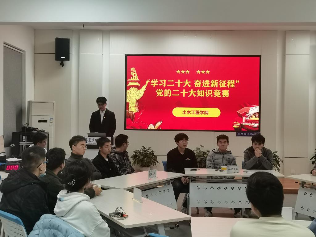 为深入学习贯彻党的二十大精神,12月8日晚上,土木工程学院学生党总支主办的“学习二十大,奋进新征程”知识抢答赛暨学生党建工作年度总结表彰大会在工科二号楼A304会议室举办。院党委副书记黄阿明、学生党建辅导员刘文成及各党支部党员代表70余人参加,学生党建中心冯俊皓主持活动。