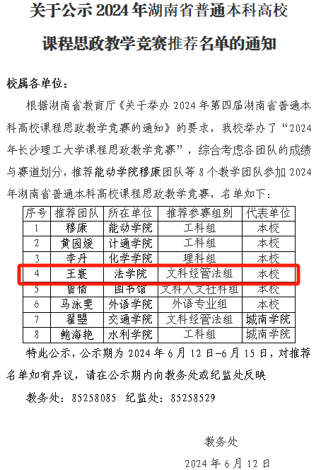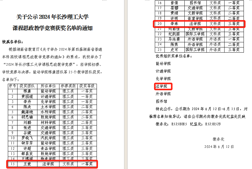经学院初赛,学校复赛与决赛,我院王寰老师获得文科类一等奖、李殊老师获得文科类三等奖的优异成绩。学院获得优秀组织奖。王寰团队经推荐将代表学校参加2024年湖南省普通本科高校课程思政教学竞赛。(文/胡枫华 一审/何凌 二审/孙亚贤 三审/徐莉)