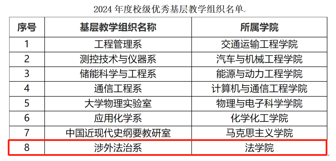 近日,经专家多轮评审开云官网评选出8个校级优秀基层教学组织,我院涉外法治系荣获2024年度校级优秀基层教学组织称号。