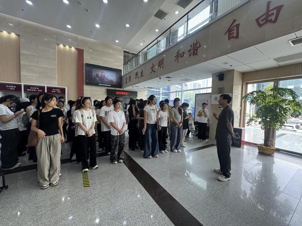 模拟法庭结束后,学生团队前往雨花区人民法院本部参观,依次走访了立案庭、执行指挥中心、少年法庭等场所,直观感受到了“司法为民”的制度实践与人文关怀。参观结束后,师生集中观看了法院宣传片,深入了解法官在司法一线的责任与坚守。最后,全体成员在升旗坪合影留念,为本次法学认知实习之旅画上圆满句号。