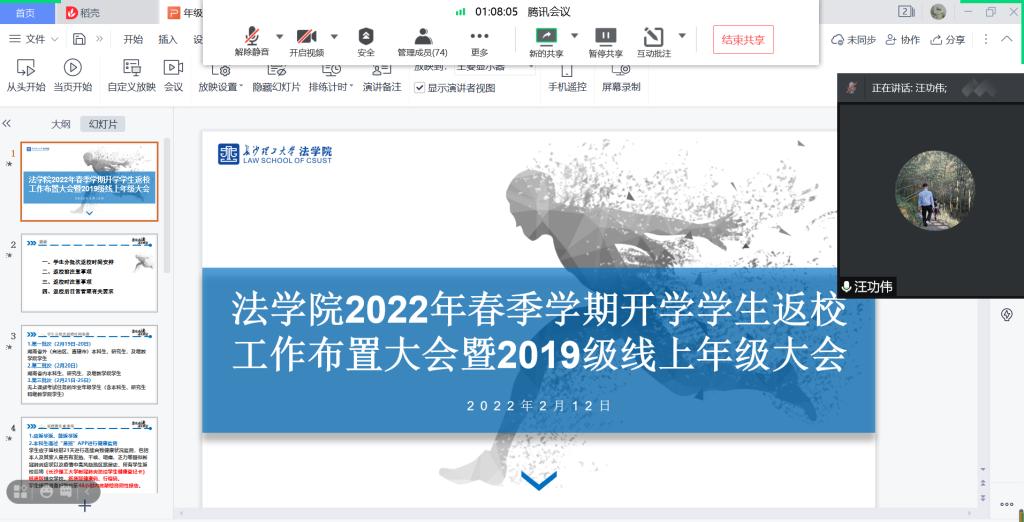2月12日法学院利用腾讯会议分时间、分批次召开年级大会,学院党总支副书记汪功伟、各年级辅导员和全体学生参加会议。