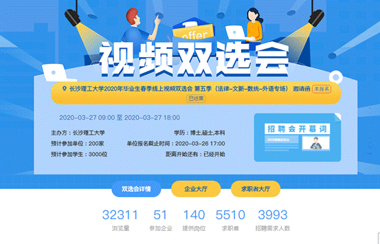为深入贯彻落实国家、湖南省关于疫情防控期间稳就业工作的相关指示精神和工作部署,积极开展“互联网+”就业服务,促进毕业生充分就业、高质量就业,助力毕业生找到心仪岗位。3月27日,开云kaiyun体育2020届“法律-文新-数统-外语专场”毕业生春季双选会以网络形式顺利召开,中交天津航道局、五矿二十三冶、湖南云天律师事务所等51家用人单位参与宣讲招聘,活动吸引了开云kaiyun体育、北京师范大学、贵州大学等100余家高校本硕博5000余名毕业生浏览、应聘。