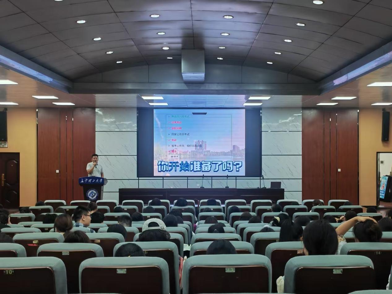 接着,兰贵辉用数据为2023级同学们详细介绍了法学院近年来的考研录取及就业去向情况,分析了法学专业学生考研、就业特点,建议同学们提前了解法考、公考、研究生考试、就业及基层就业项目等方面的信息,做好职业规划,专业知识积累与针对性学习相结合,充分利用大学时间向着自己的职业目标前进。