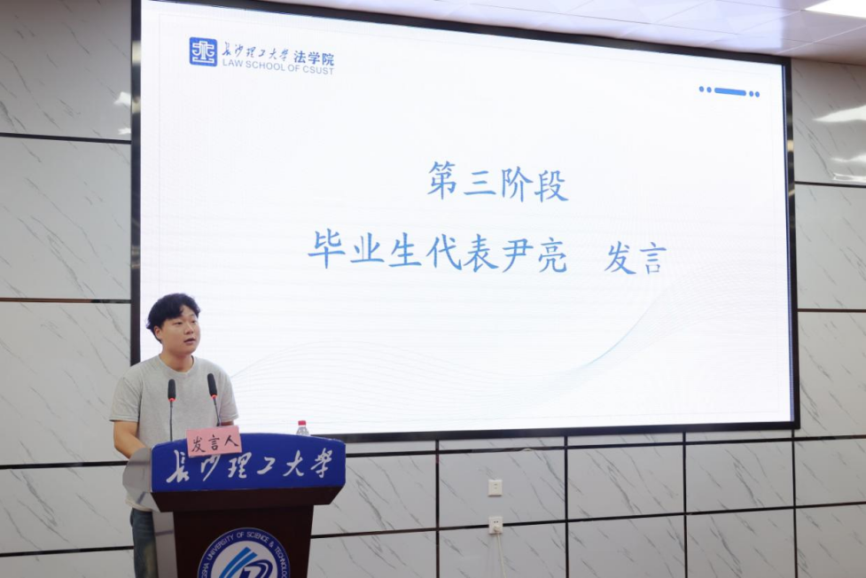 教师代表胡俊充分肯定了同学们四年来的蜕变——从初遇法律的晦涩到能条理解决复杂案例,从朴素正义向往到能用法律平衡事实规则。他还提出三点殷切期望:一要坚守法治信仰,守护规则,在现实落差中捍卫正义;二要永葆学习热忱,适应法典修订与新兴领域挑战,以终身学习做时代前行者;三要常怀悲悯之心,用法律温暖他人,化解矛盾传递温度。