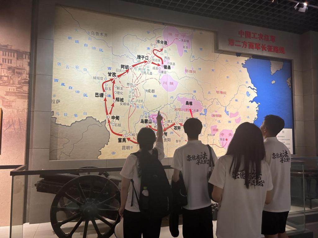 在参观过程中,贺龙元帅“两把菜刀闹革命”的英勇事迹让实践团成员们深感震撼。为深度挖掘红色法治基因,实践团还特别设计了"红色法治足迹寻访"活动,在地图上寻找贺龙元帅当年的革命路线。