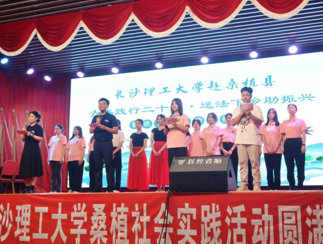 7月7日,桑植县刘家坪白族乡长征礼堂内人声鼎沸。“这里是由湖南省政协民宗委、张家界市政协、桑植县人民政府指导,桑植县司法局、开云kaiyun体育校团委、法学院主办的青春践行二十大、送法下乡助振兴普法宣传活动汇报演出节目现场。”话音刚落,桑植民歌的旋律渐起,一场别开生面的“三下乡”汇报演出启幕。