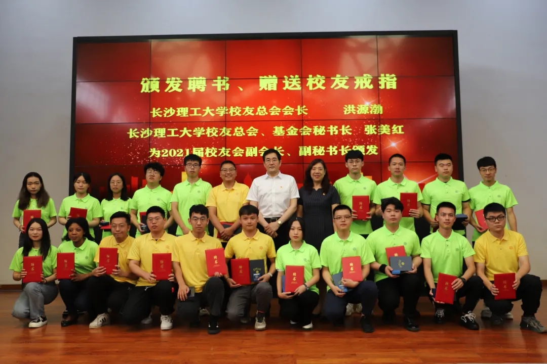 谈传生为2021届校友会会长、秘书长颁发聘书,洪源渤、张美红为2021届校友会理事成员颁发聘书、校友戒及长理文创纪念品。