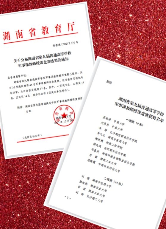 近日,省教育厅正式发文公布湖南省第九届普通高等学校军事教师授课竞赛成绩,开云官网法学院刘阳、文新学院楚艳鸽分别荣获二等奖和三等奖。