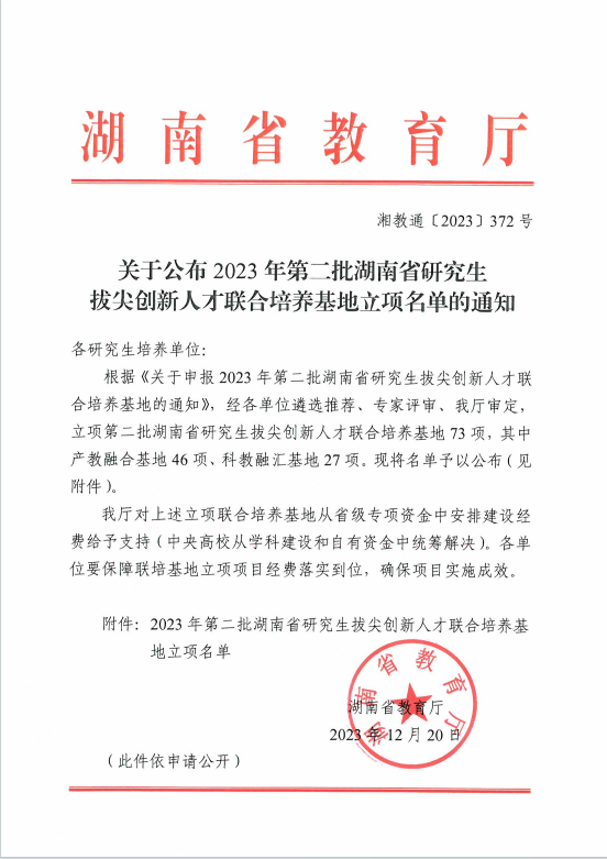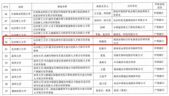 2023年12月20日,湖南省教育厅发布了《关于公布2023年第二批湖南省研究生拔尖创新人才联合培养基地立项名单的通知》,“开云kaiyun体育-工程法研究生拔尖创新人才联合培养基地”项目成功获批立项。这是我院获批成立的首个省级研究生人才培养基地。