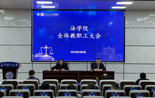 3月4日下午,法学院在金盆岭校区四号教学楼1楼学术报告厅召开新学期第一次全体教职工大会,会议由党委书记龚文斌主持,全院教职工参加会议。