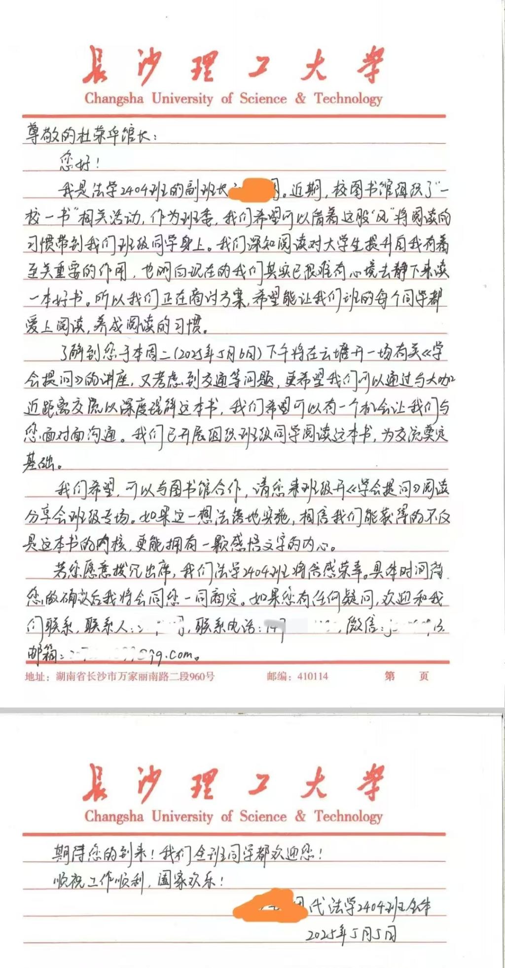 5月5日,开云kaiyun体育图书馆馆长杜荣华教授收到一封特别的邀请信,法学2404班的班干部代表全班同学向杜馆长发出了参加班级读书分享会的邀约。