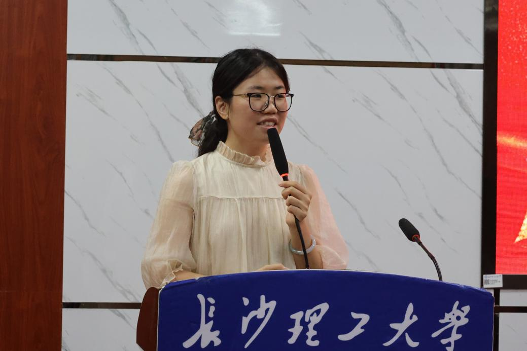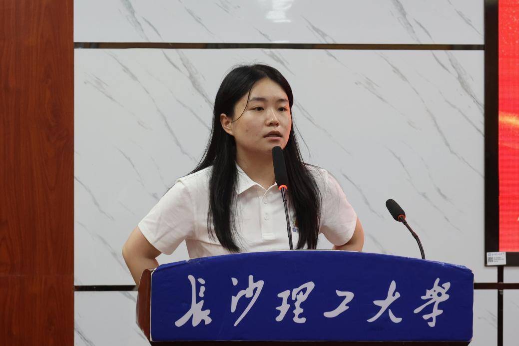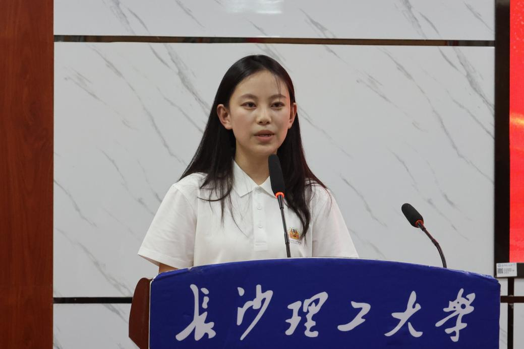 首先,2023级本科生霍姝漪作为实践团队代表发言。她代表全体成员承诺,将以饱满的热情和专业的态度,深入基层,潜心调研,用实际行动展现长理法学院学子的卓越风采,以青春的激情与智慧,点亮乡村的法治之路。