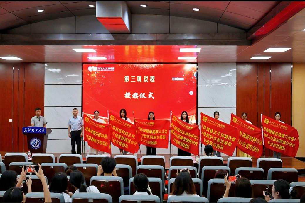 在庄重的授旗环节,龚文斌老师为7支暑期实践团队授予队旗。队旗的交接,不仅是荣誉的象征,更是责任与使命的传递。各团队代表纷纷表示,将不负学院期望,以实际行动践行法律人的使命与担当。
