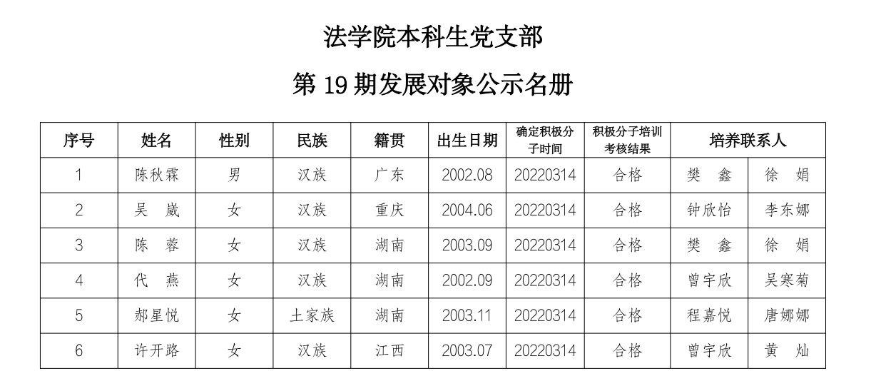 根据群团组织推优情况,支部于2023年10月13日召开支部委员会,会议应到支部委员5人,实到5人,经票决一致,决定确定陈秋霖等六名同志为发展对象。为发扬民主,广泛听取党内外群众意见,接受广大党员群众监督,现将陈秋霖等六名同志的情况予以公示,公示期限为五个工作日(2023 年10月13日—19日)。如有异议,可在公示期内向本支部反映。