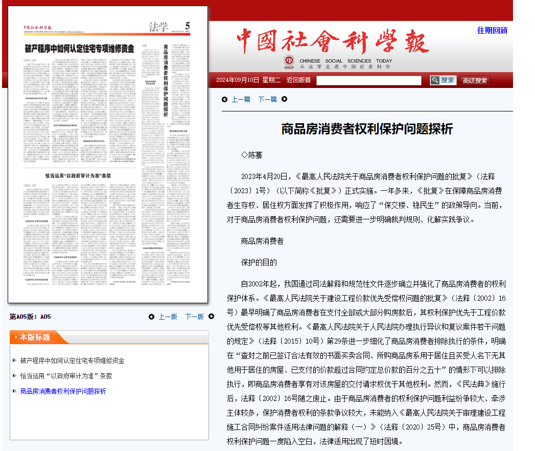 近日,开云kaiyun体育法学院讲师陈骞的理论文章《商品房消费者权利保护问题探析》在《中国社会科学报》发表。