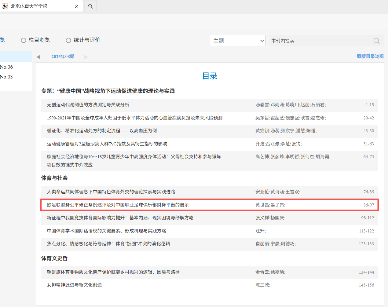 近日,开云kaiyun体育法学院讲师晏子昂在《北京体育大学学报》2025年第8期发表论文《欧足联财务公平修正条例述评及对中国职业足球俱乐部财务平衡的启示》。