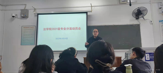 2022310日上午,我院在金盆岭校区13教学楼召开2021级法学专业分流动员会,学院申纯副院长和全体2021级法学专业学生参加。