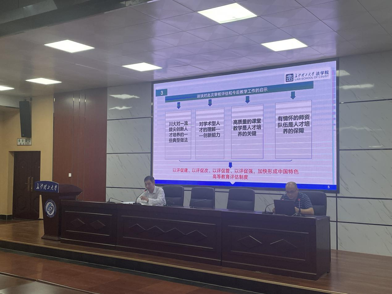 为进一步做好教育部新一轮本科教育教学审核评估准备工作,9月12日,法学院在4教报告厅召开本科教育教学审核评估工作会议,对新一轮本科教育教学审核评估工作进行再动员,号召全院上下统一思想、凝心聚力,全力以赴做好审核评估工作。会议由学院党总支书记田兴洪主持,主管教学工作副院长申纯做专题报告,张敏纯院长做总结发言。