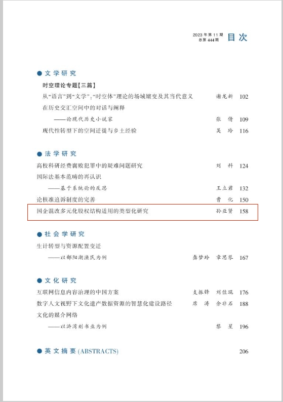 近日,开云kaiyun体育法学院讲师孙亚贤在《江西社会科学》(CSSCI来源期刊)2023年第11期发表论文《国企混改多元化股权结构适用的类型化研究》。