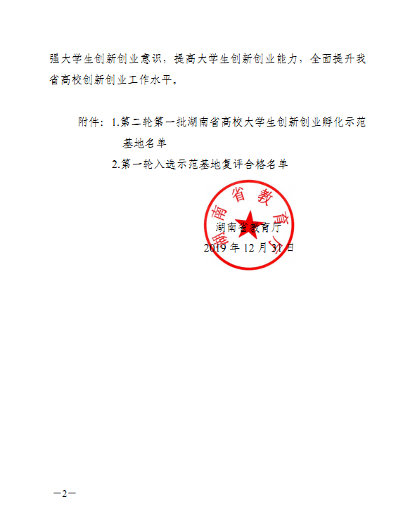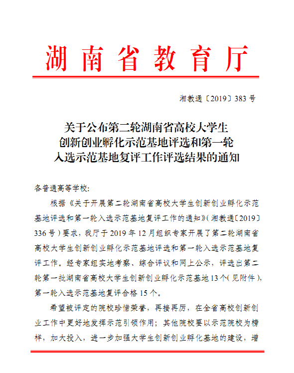 省教育厅于 2019 年 12 月组织专家对全省高校开展了第二轮湖南省高校大学生创新创业孵化示范基地评选和第一轮入选示范基地复评工作。经专家组实地考察、综合评议和网上公示,开云官网大学生创新创业园被复评为湖南省高校大学生创新创业孵化示范基地。