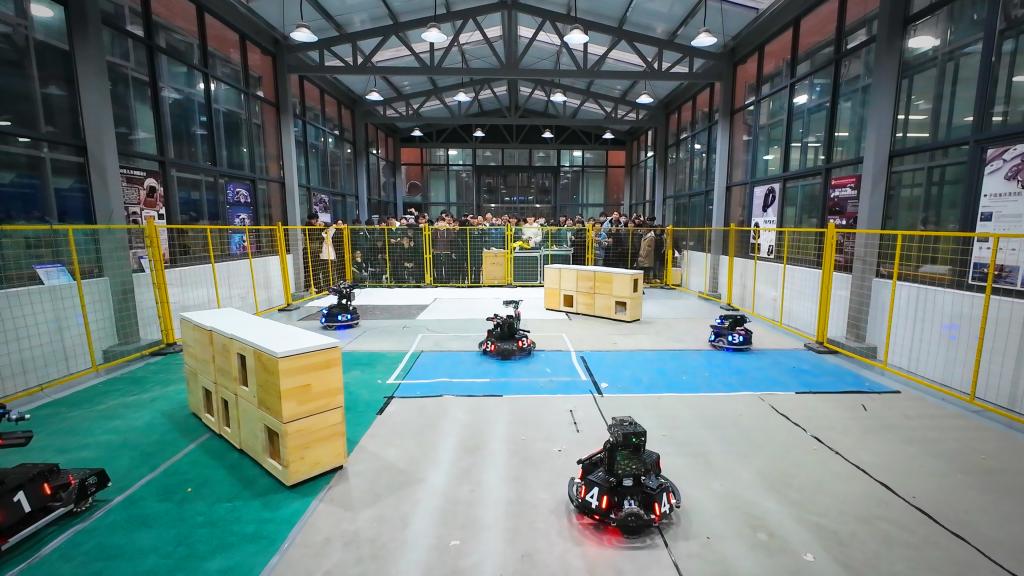 RoboMaster机甲大师赛作为一项综合性机器人对抗赛事,涵盖了机械设计、电子控制、人工智能等多学科领域。本次四校友谊赛以开放式技术验证为核心,聚焦智能机器人系统的模块化开发与协同创新。各校代表队基于RoboMaster技术框架,分别展示了在机械传动优化、嵌入式系统开发及多机通信协议等领域的特色成果。联合赛事现场呈现出产学研深度融合的生动图景。红蓝双方在对抗演练中同步开展技术调试,操作团队通过专业软件实时监测机器人运动轨迹与机械臂动态参数,针对性地优化控制算法与动力分配策略。步兵机器人的战术突进、英雄机器人的精准打击与工程机器人的快速支援,它们通过灵活的走位和默契的团队配合,展现了当代大学生卓越的科技创新能力和实践动手能力。