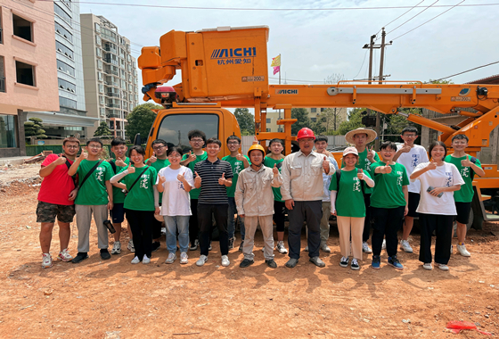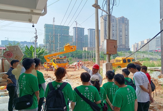 7月19日上午10点 ,邵阳火车站旁一社区因用电量扩增,需增设新的输电线路,十三名实践队队员在西湖子公司尹书记和辅导员范凯的带领下前往现场观摩带电作业。