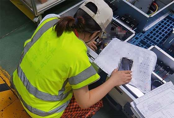 “究竟是25安培,还是10安培?”实践队员在检查处的标签时,发现了所检查电器箱的数据显示器标签所标注额定电流与设计图纸上的数据不符。在生产过程中,任何一个小失误都有可能造成整个流水线的损失。实践队员秉持着认真负责的工作态度,及时向车间质检员反应情况。车间师傅、质检员与区域监督员探讨后,得到了技术总监的确认,得知所安装器件电流能满足正常使用需求即可。设计图纸的标注不准确造成了此次“风波”。