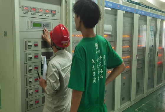 抵达作业现场,赵师傅首先向实践队员讲解了运维基础知识、变电站设备巡视要点内容及隐患点检查注意事项等工作须知。开展运检作业后,刘小龙在赵师傅的指引下进行变电站内避雷器动作及泄漏电流的数据记录工作,并检查避雷器放电次数及泄露电流表数值情况,保障电力系统在正常状态下运行。同时,陶子繁跟随师傅在主控室内监控显示屏并记录蓄电池各项数据。工作间隙,师傅向陶子繁讲解发生所用变失压等故障情况下蓄电池的保供作用,并强调变电站双重保险的重要性,对此,陶子繁说到:“这次实操学习让我体会到了‘运’与‘检’相结合对电网正常运作的重要作用,深切感悟到凡电网运检预则立不预则废的道理。”