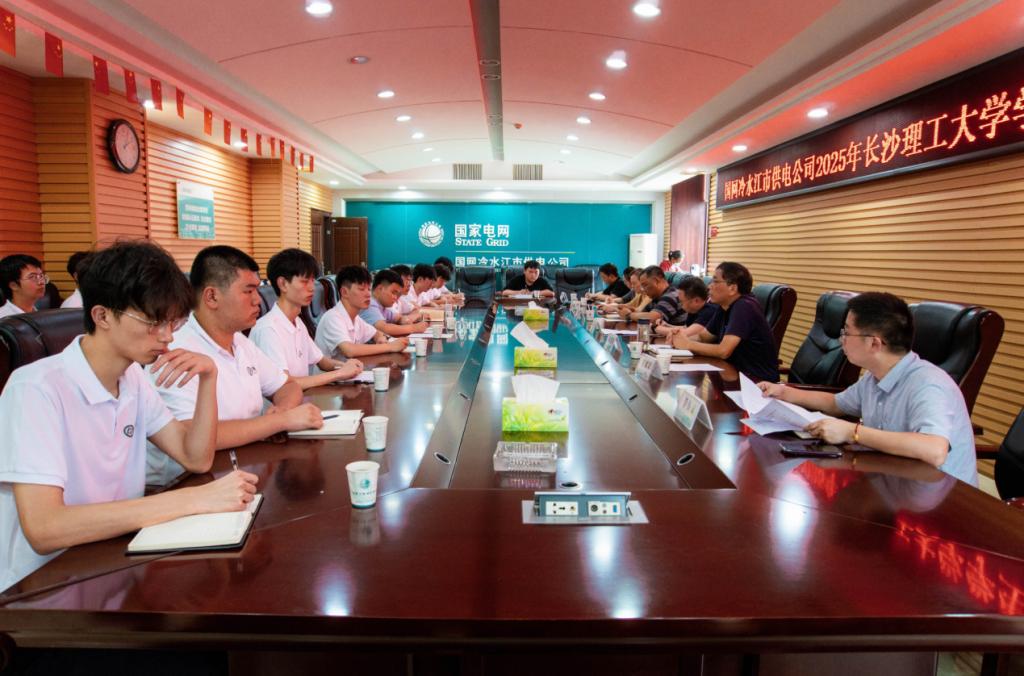 见面会上,国网冷水江供电公司总经理首先对实践队的到来表示欢迎,同时回顾了双方十年来校企合作的经历,肯定了学校在人才输送、实践交流等方面做出的成果。该公司党委书记在会上重点强调了安全生产要求,从操作规范、网络防护到高温作业防护等方面作出详细指导。最后,该公司办公室主任为队员们详细介绍了本次实践活动的具体安排与分组情况。