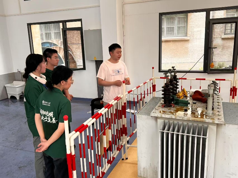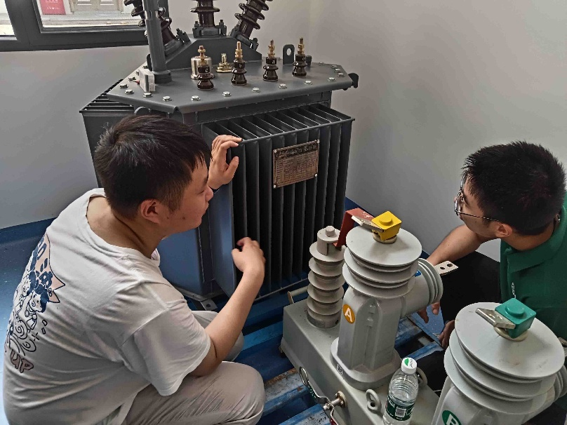 短暂休整后,沈哲民师傅带领实践队员来到变压器旁,结合实物深入浅出地讲解专业知识。他重点强调,变压器在投入现场使用前,必须完成三项关键测试:其一为绝缘电阻测试,可精准检测变压器内部是否因撞击等外力出现损坏;其二是耐压试验,主要用于检验变压器的高压与低压耐压等级,其中高压部分需能承受 28.5kV 的电压;最后是直流电阻试验,旨在评估变压器导电回路的连接性能。
