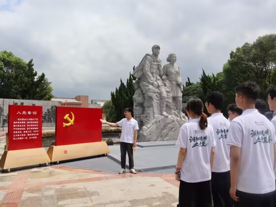 在纪念馆广场的党旗前,预备党员高驭韬借“阿庆嫂智斗刁德一”的故事给实践队员们开展了一堂微党课。“‘坚定不移的斗争意志,军民同心的鱼水情深’,沙家浜精神是战火中淬炼的信仰之光,更是穿越时空的精神火炬。”高驭韬的一番话让队员们频频点头,现场掌声阵阵。